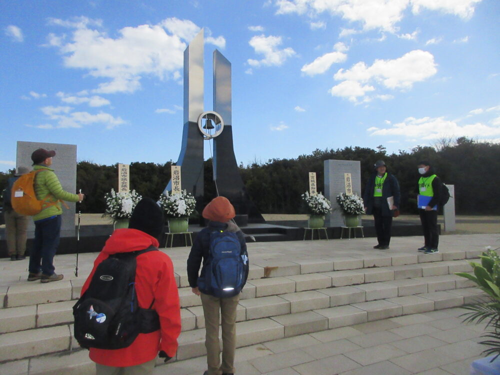 また、同時間帯には「いわぬま震災語り部の会」によるフリーガイドが実施され、震災当時の状況や復興の歩みについて現地で説明をいたしました。慰霊に訪れた方々は、語り部の話に真剣に耳を傾け、防災・減災への意識を高める機会となりました。