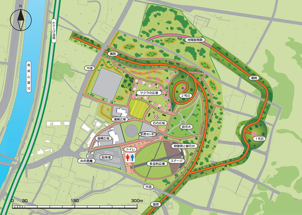 仙台湾海浜の恵まれた自然環境を活用し、健全なレクリェーション活動の場として整備された緑地です。岩沼市の『市の花:つつじ』が植えられた丘とテニスコートや野球場、健康遊具があります。