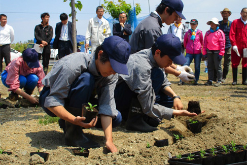 - 二野倉公園の「桜広場」は、宮城県農業高校科学部が桜の苗木を植樹し整備したものです。桜の成長を促すため、桜の周りにカワラナデシコを円形に配置するなど、独特の工夫がされています。植樹された桜は名取市沿岸部にあった旧校舎で津波から生き残ったものの子孫です。約20本あった桜のうち6本が生き残り、組織培養して命をつないできた桜です。「私達は浸水後、花を咲かせた校庭の桜を復興の桜として未来に残せないかとプロジェクトを始めました。桜広場への植樹を通して、また花見に集うことで復興を目指す人たちに笑顔が生まれ、やがては桜を核として新しくコミュニティが形成されることを望んでいます。」(宮城県農業高校科学部顧問/尾形政幸さん)この桜には復興へのみんなの想いが込められています。