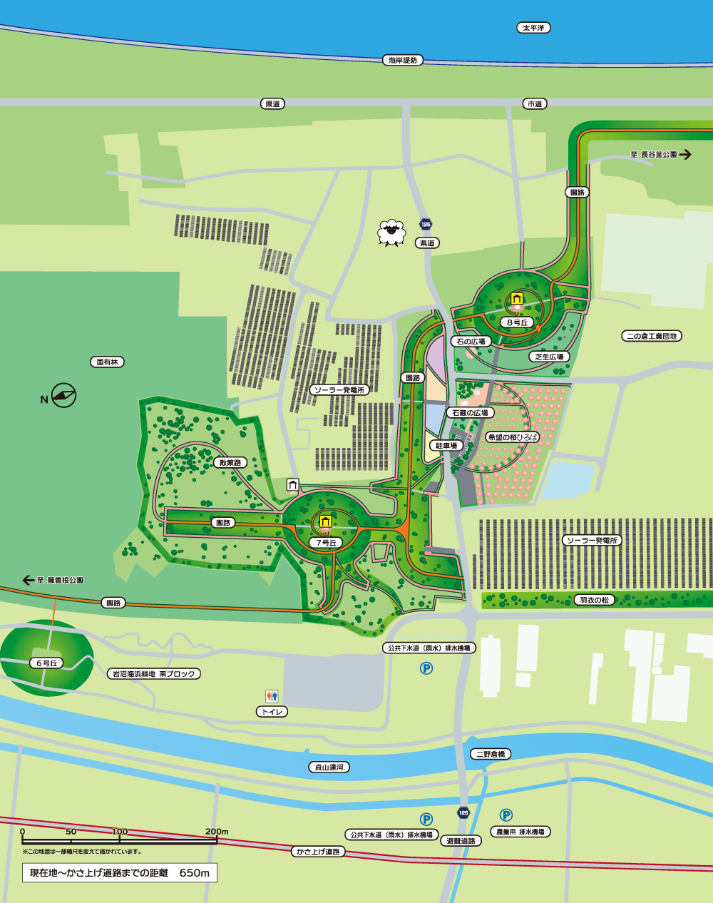 - 岩沼市と地方創生に関する協定を締結した(公社)青年海外協力協会が連携し、災害危険区域に指定された荒れたままの集落跡地を活用して羊の牧場や農園、広場、ドッグランなどを備えた複合施設を運営しています。沿岸地区の有効活用と、地域と震災の記憶の風化防止を図ると共に、運営・管理を地域の方々と行うことで、多くの交流機会と生きがいを創出していく場として再生する試みが行われています。また、アニマルセラピーによる被災者の心の復興と同時に雑草を食べさせることで景観アップを目的とした「いわぬまひつじ」の放牧のほか、農園やあずま屋なども交流場所として整備されています。