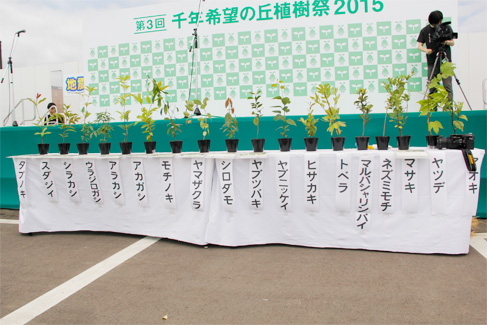 Volunteers from all over the country have planted nursery trees in this area since 2013. The thick, multispecies planting (the Miyawaki method) will re-create a naturally selected forest. In 15 to 20 years, these trees will become a forest, thus helping to reduce the power of tsunamis as part of a green coastal tide embankment.